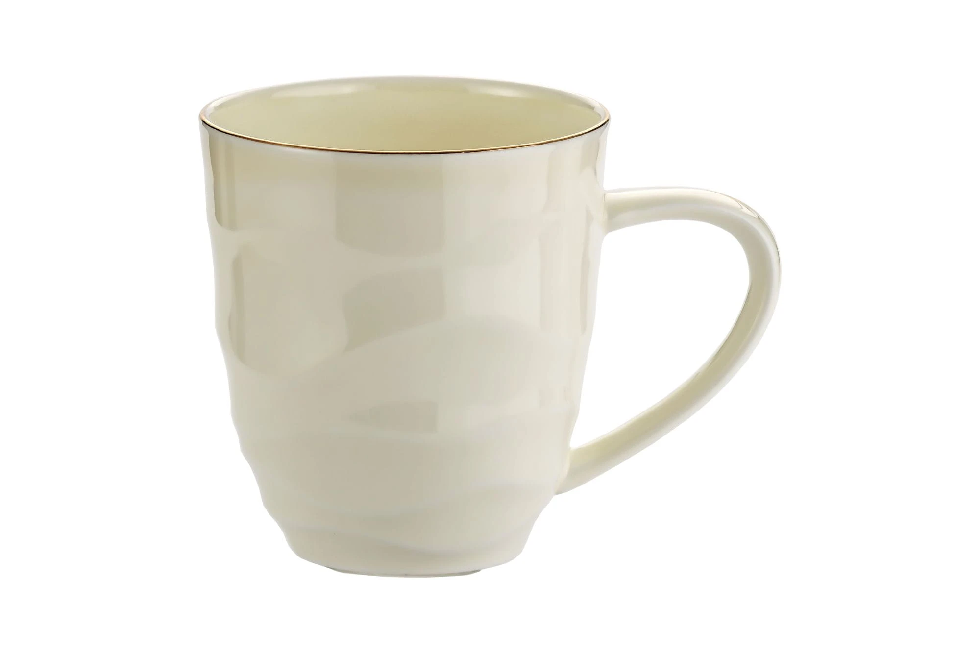 Ekskluzywny kubek z kremowej porcelany kostnej o delikatnej, półprzezroczystej strukturze. Naczynie wyróżniają subtelne, faliste tłoczenia, które są wyraźnie wyczuwalne zarówno na zewnętrznej, jak i wewnętrznej powierzchni – nadając kubkowi elegancji oraz wyjątkowego charakteru 3D.