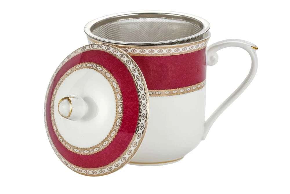 Wykonany z bardzo dobrej jakości kostnej porcelany komplet do zaparzania ziół/herbaty(itp.) składający się z kubka 400ml z przykrywką i zaparzacza/sitka.