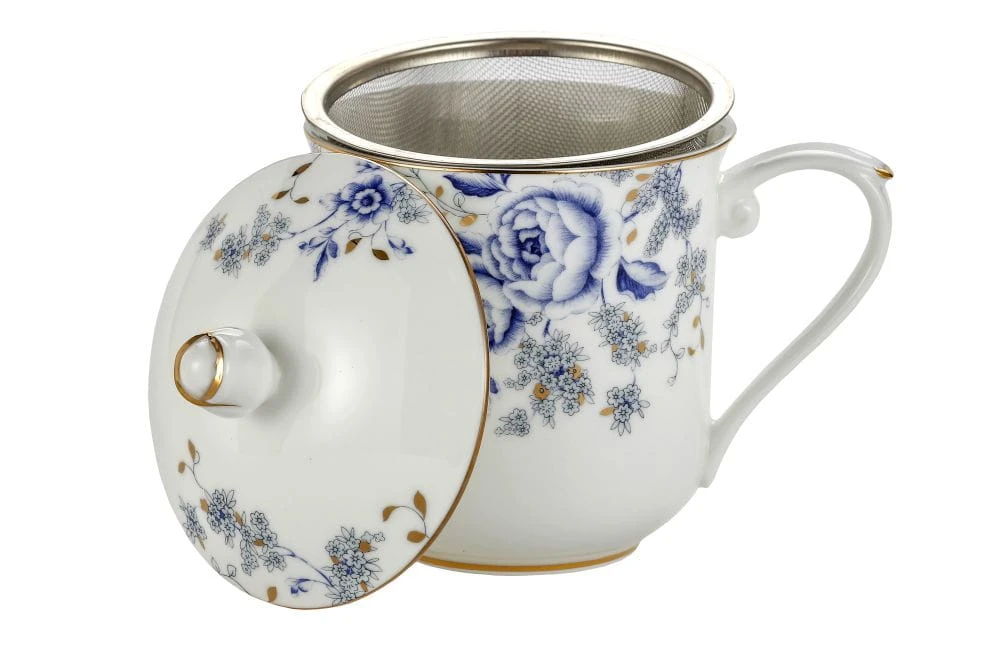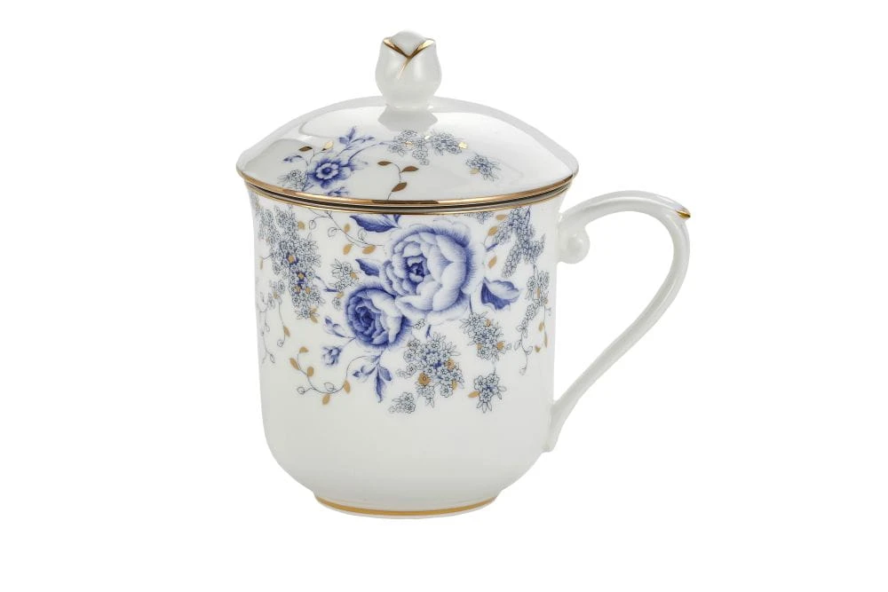 Kubek wraz z przykrywką o oryginalnym/ładnym wizualnie motywie kwiatowym w odcieniach niebieskiego ze zdobieniami wykonanymi 24k złotem.