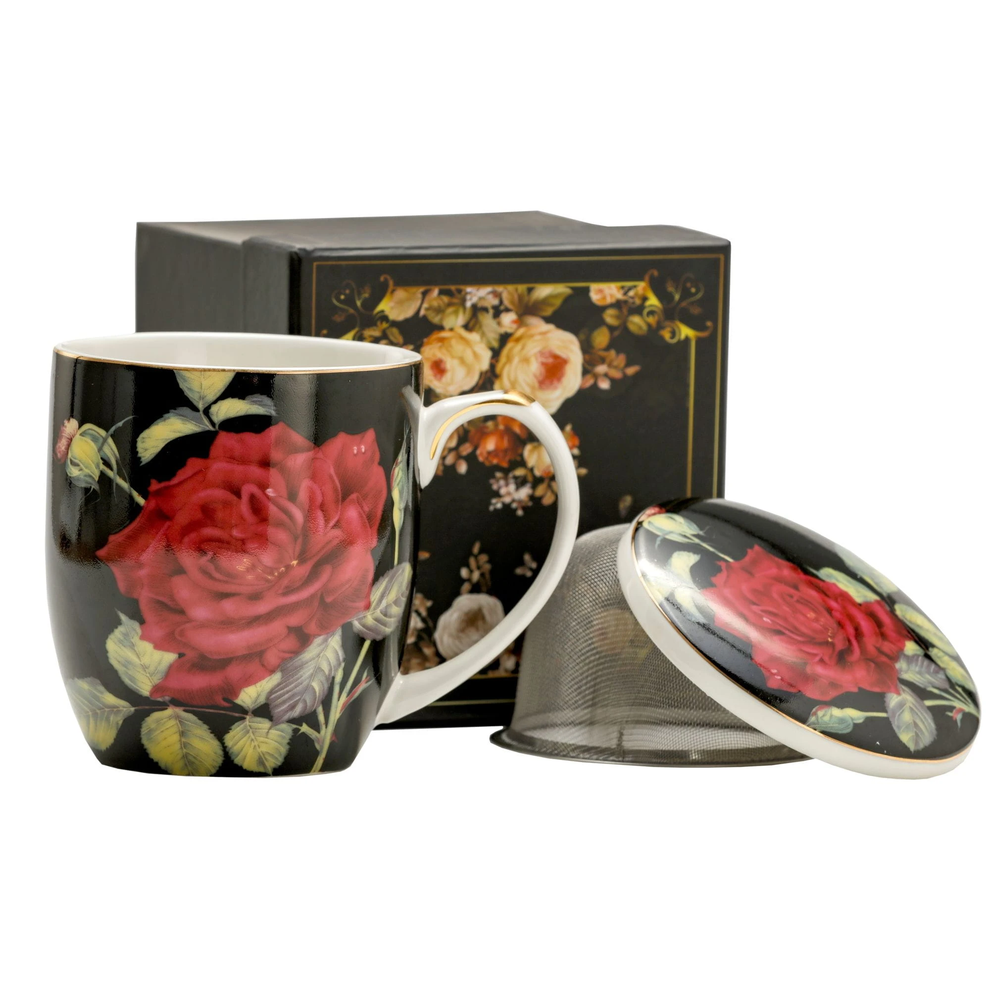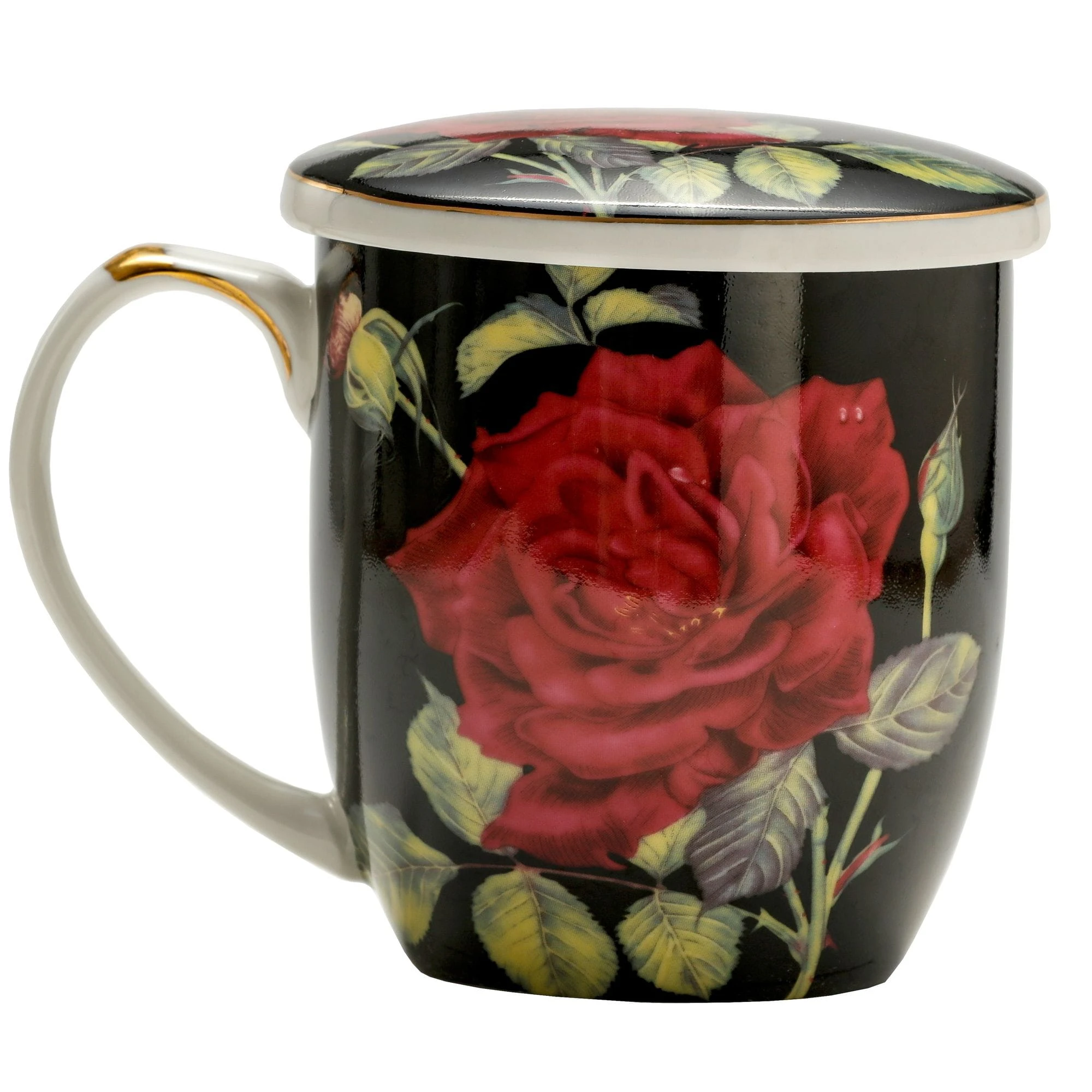 Wykonany z dobrej jakości porcelany kostnej t. "Fine Bone China" kubek Red Rose(czerwona róża) wraz z przykrywką i metalowym sitkiem/zaparzaczem z naniesionym kwiatowym motywem, z delikatnymi złoceniami obrzeży.