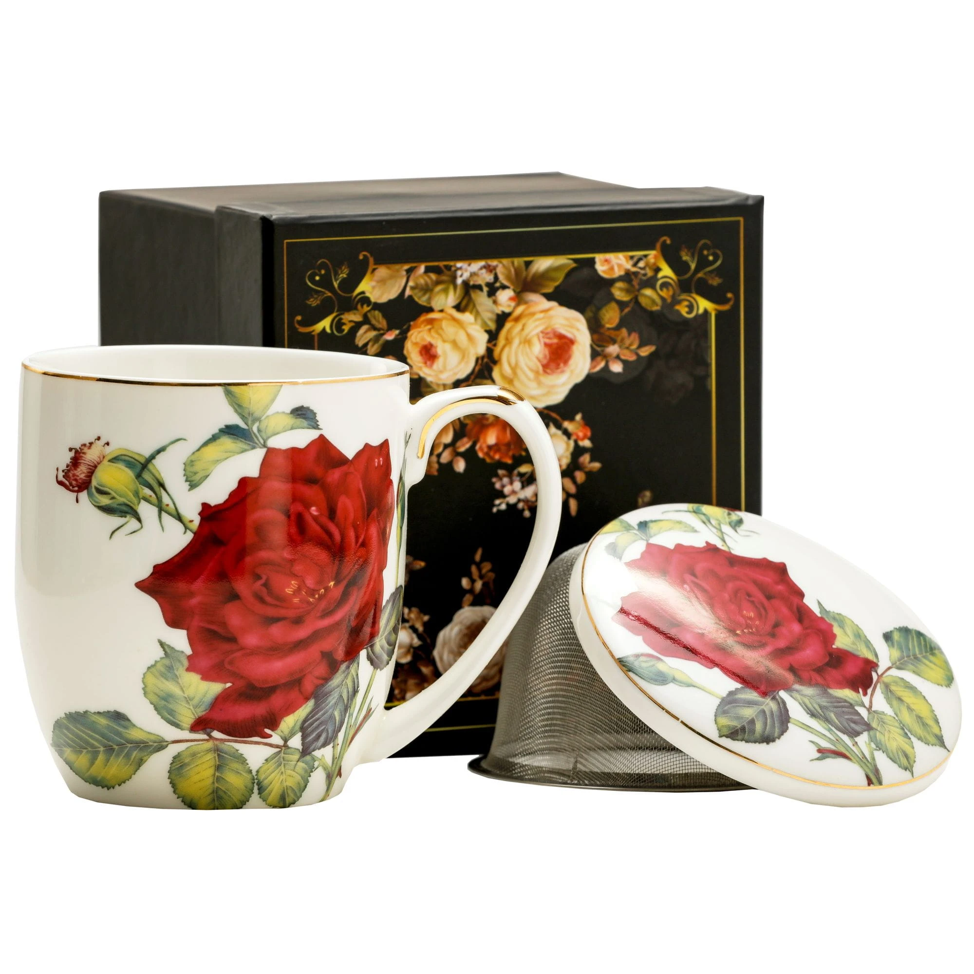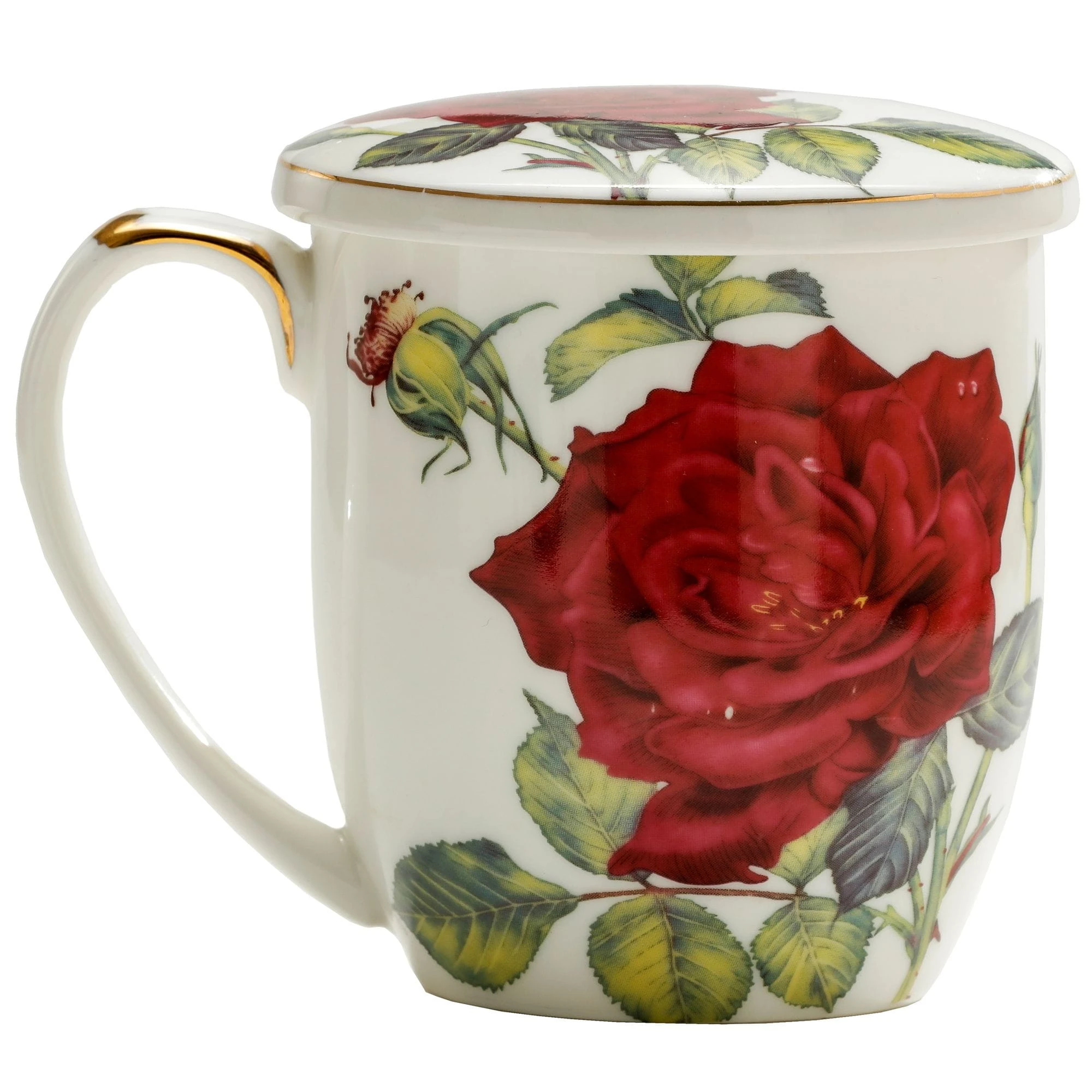 Wykonany z dobrej jakości porcelany kostnej t. "Fine Bone China" kubek Red Rose(czerwona róża) wraz z przykrywką i metalowym sitkiem/zaparzaczem z naniesionym kwiatowym motywem, z delikatnymi złoceniami obrzeży.