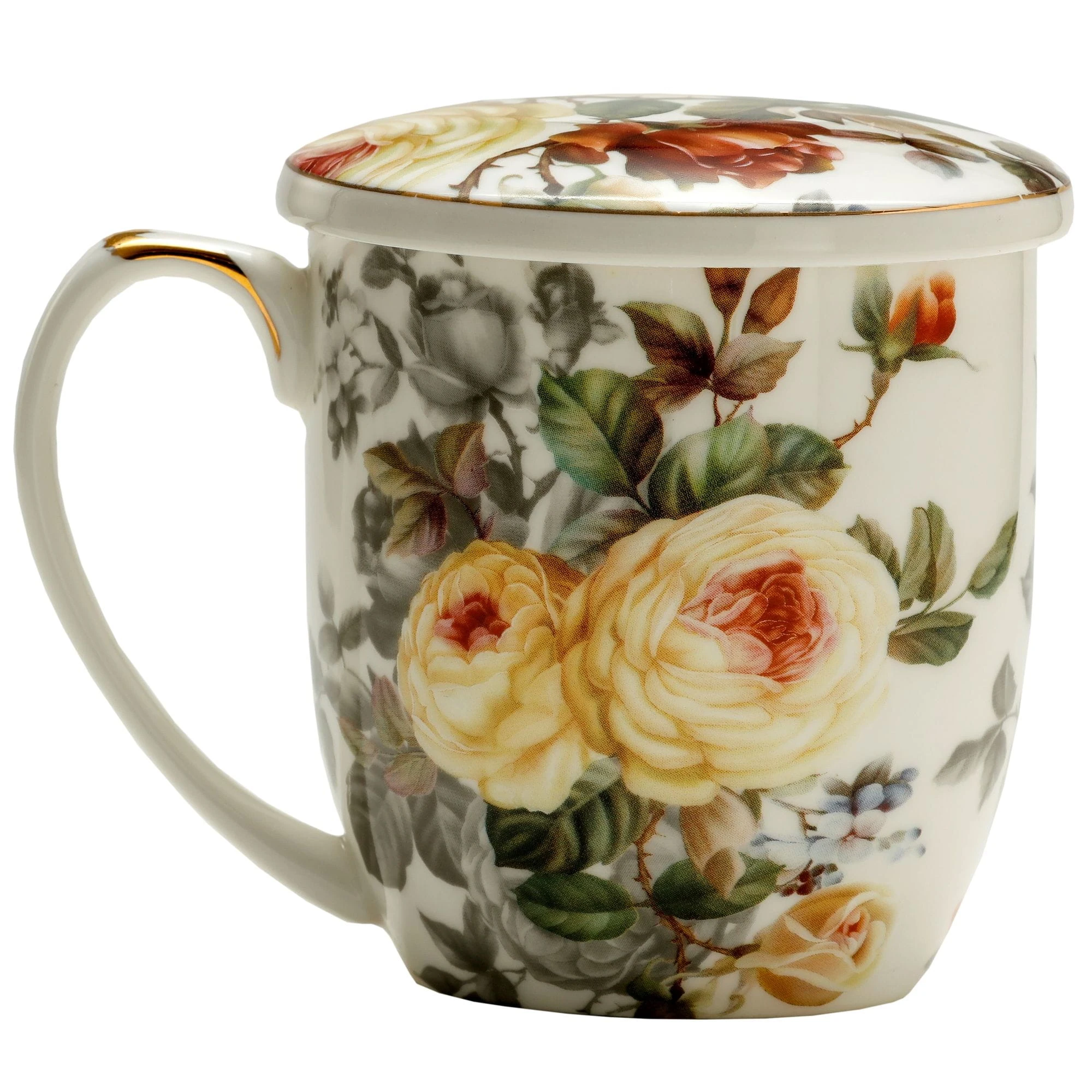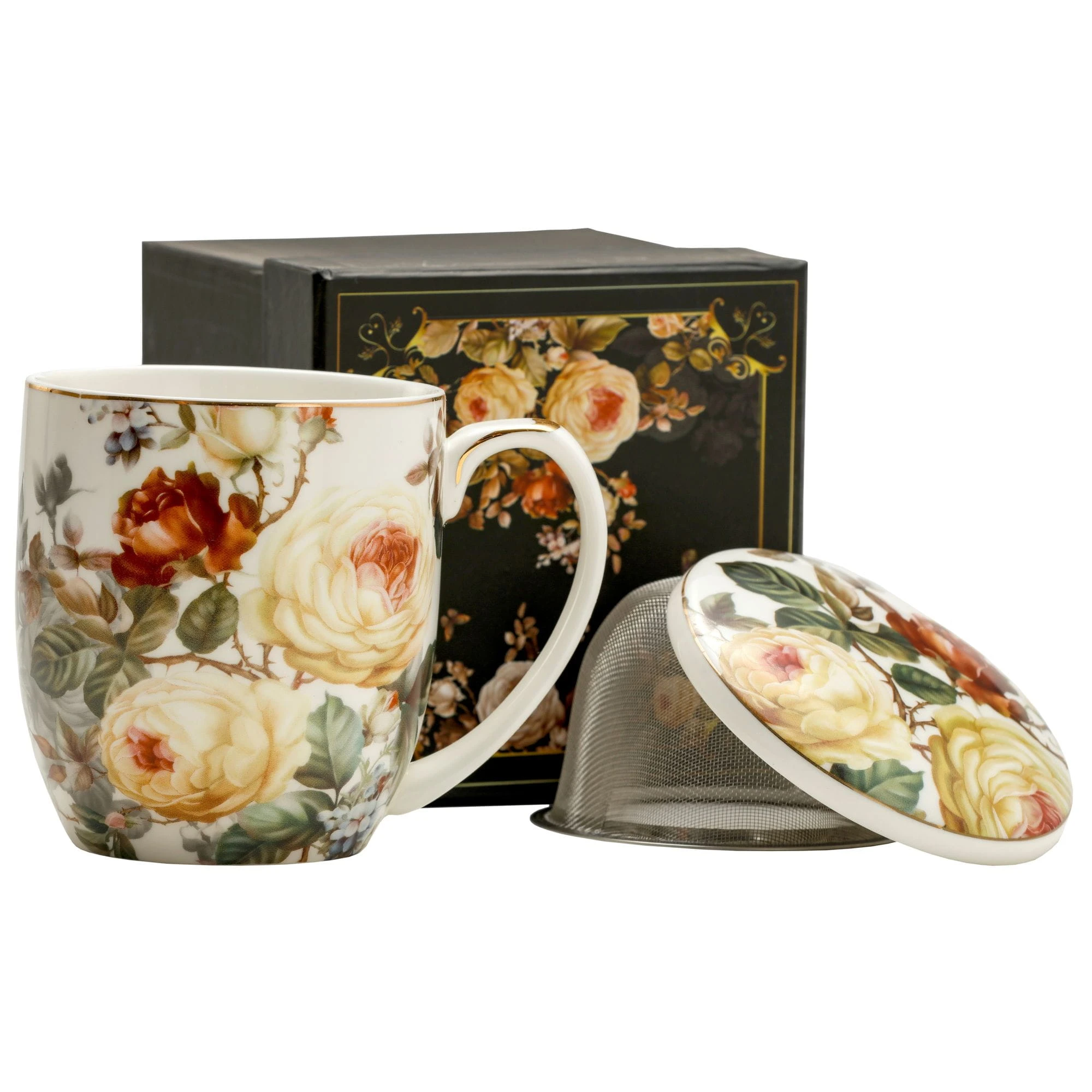 Wykonany z dobrej jakości porcelany kostnej t. "Fine Bone China" kubek Roses(róże) wraz z przykrywką i metalowym sitkiem/zaparzaczem z naniesionym kwiatowym motywem, z delikatnymi złoceniami obrzeży.