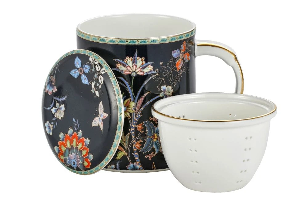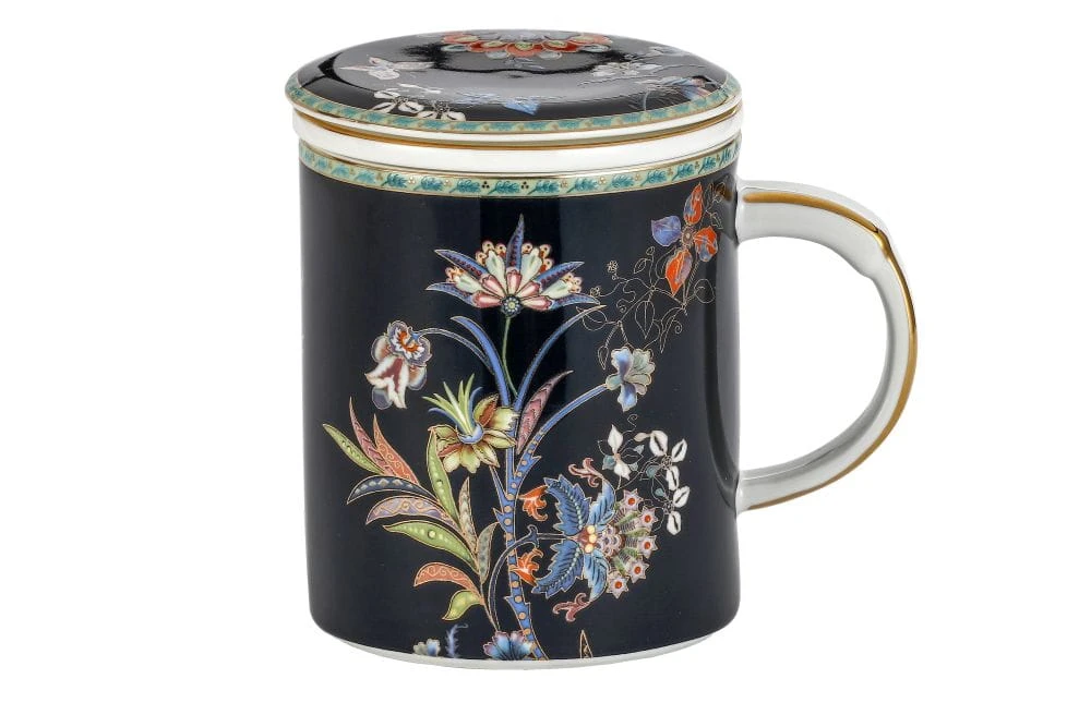 Kubek wraz z przykrywką o oryginalnym/ładnym wizualnie motywie kwiatowym z perfekcyjnymi zdobieniami wykonanymi 24k złotem.