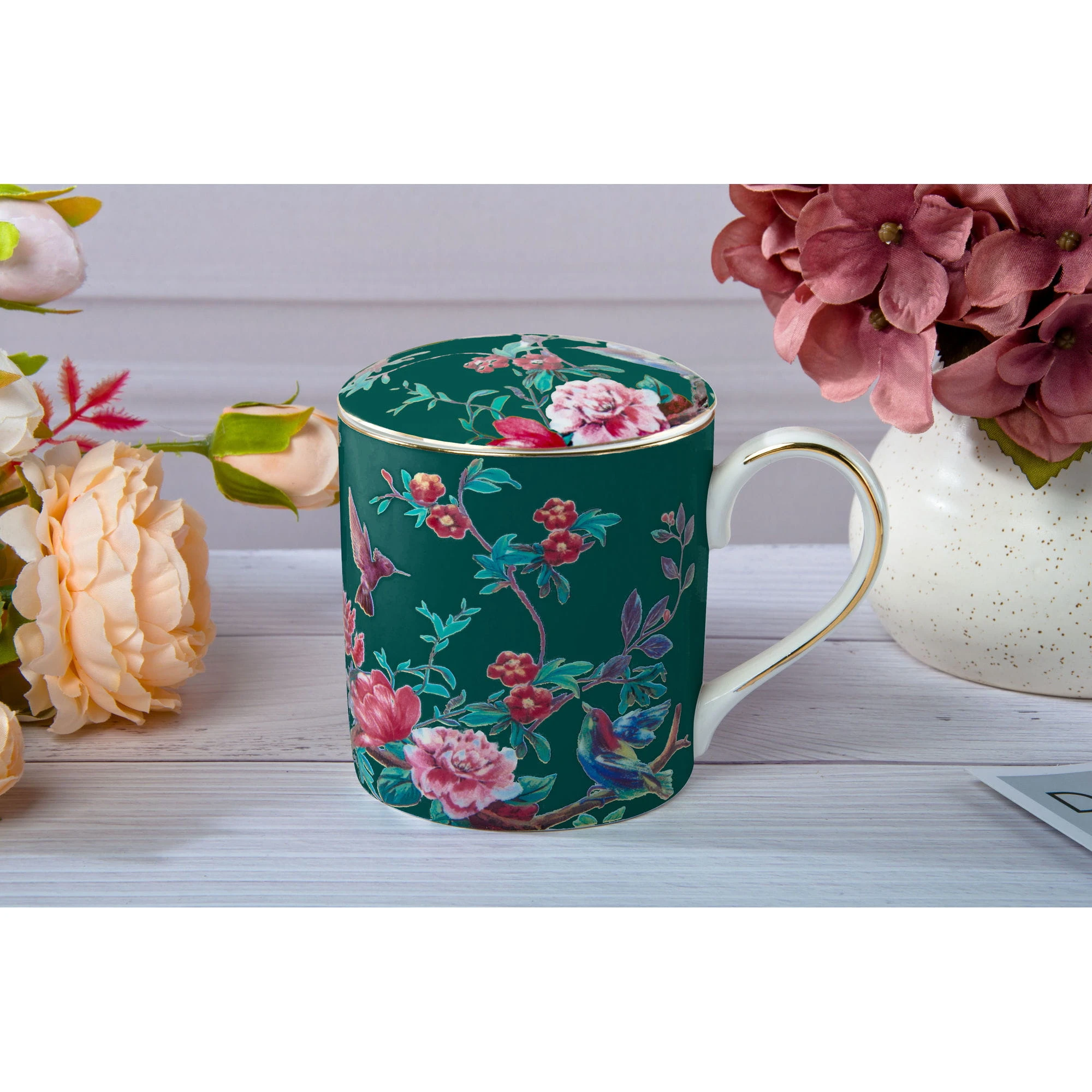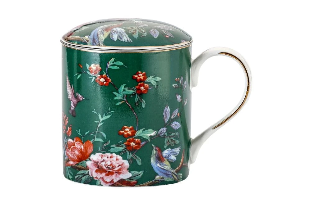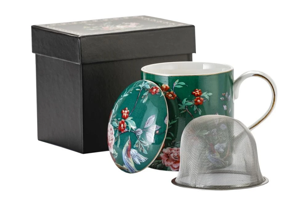 Przedstawiamy kubek z przykrywką do zaparzania Flowers(zielona wersja kolorystyczna) wykonany z dobrej jakości porcelany kostnej t. "Fine Bone China" o ładnym motywie kwiatowym, intensywnym kolorystycznie z dodatkami zdobień obrzeży wykonanych 18k złotem.
