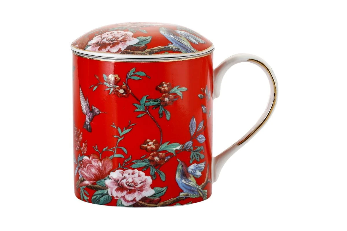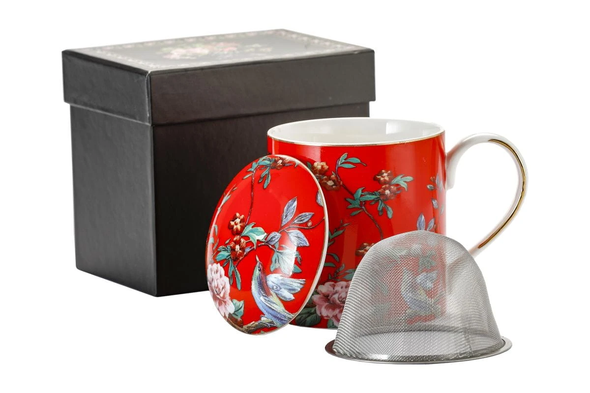 Przedstawiamy kubek z przykrywką do zaparzania Flowers(czerwona wersja kolorystyczna) wykonany z dobrej jakości porcelany kostnej t. "Fine Bone China" o ładnym motywie kwiatowym, intensywnym kolorystycznie z dodatkami zdobień obrzeży wykonanych 18k złotem.