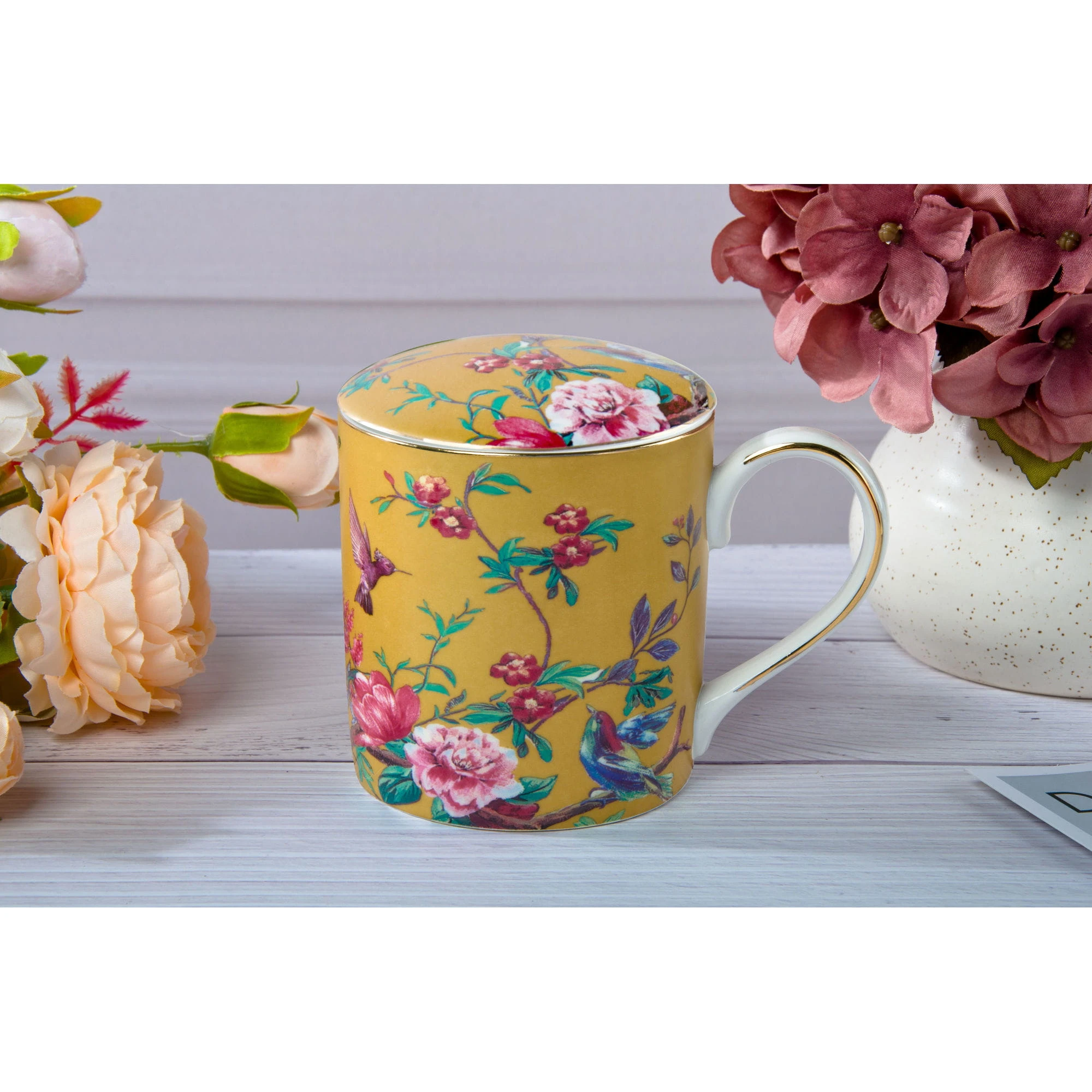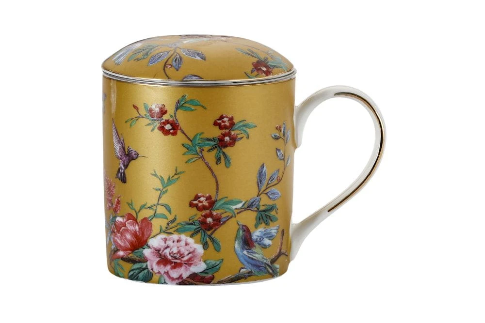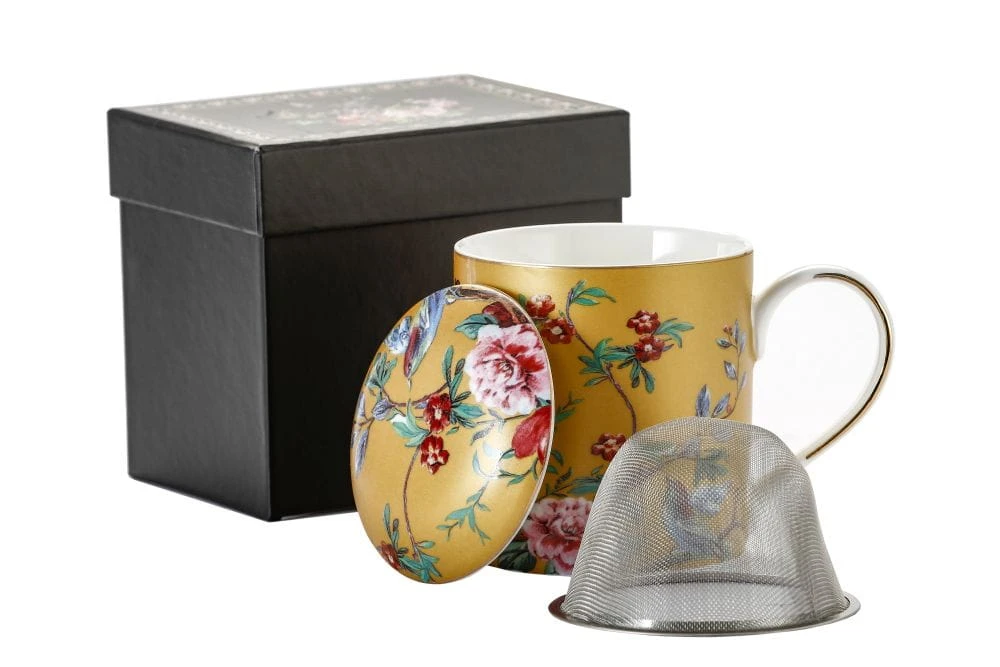 Przedstawiamy kubek z przykrywką do zaparzania Flowers(złota wersja kolorystyczna) wykonany z dobrej jakości porcelany kostnej t. "Fine Bone China" o ładnym motywie kwiatowym, intensywnym kolorystycznie z dodatkami zdobień obrzeży wykonanych 18k złotem.