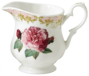 Dzbanuszek na mleko/śmietankę do kawy/herbaty, czyli tzw. "mlecznik" z mini-kolekcji Roy Kirkham - Vintage Rose o bardzo ładnym motywie w subtelnej kolorystyce przedstawiającym oczywiście różę z dekoracjami w ponadczasowym stylu vintage.