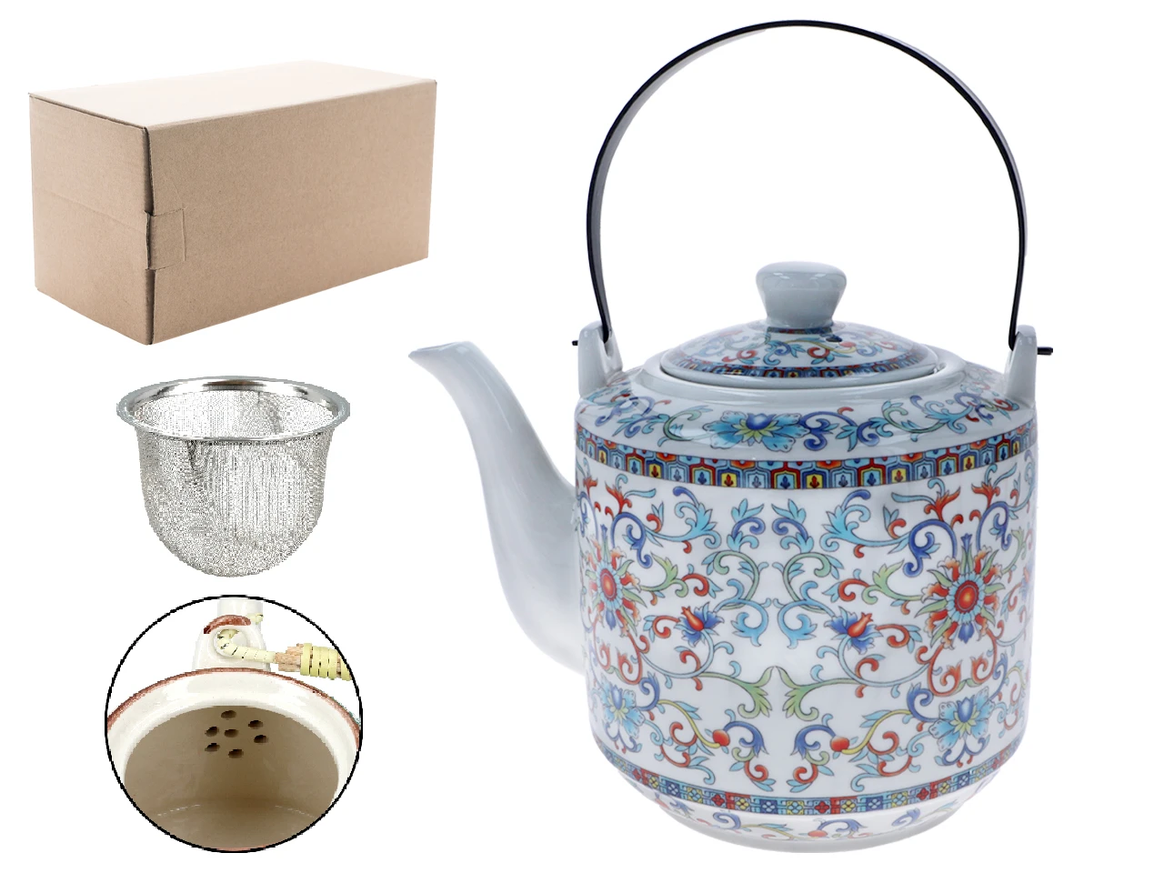 Wykonany z dobrej jakości ceramiki/porcelitu czajniczek z metalowym zaparzaczem.