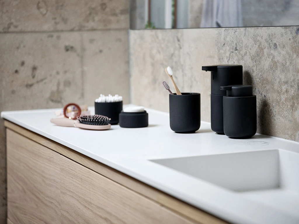 Dozownik mydła z serii wannowej Ume został zaprojektowany z poręczną wylewką i ma silikonową podstawę, dzięki czemu stoi stabilnie na blacie lub w odpowiednim uchwycie ściennym. Za harmonijnymi elementami serii stoi designerskie trio VE2.