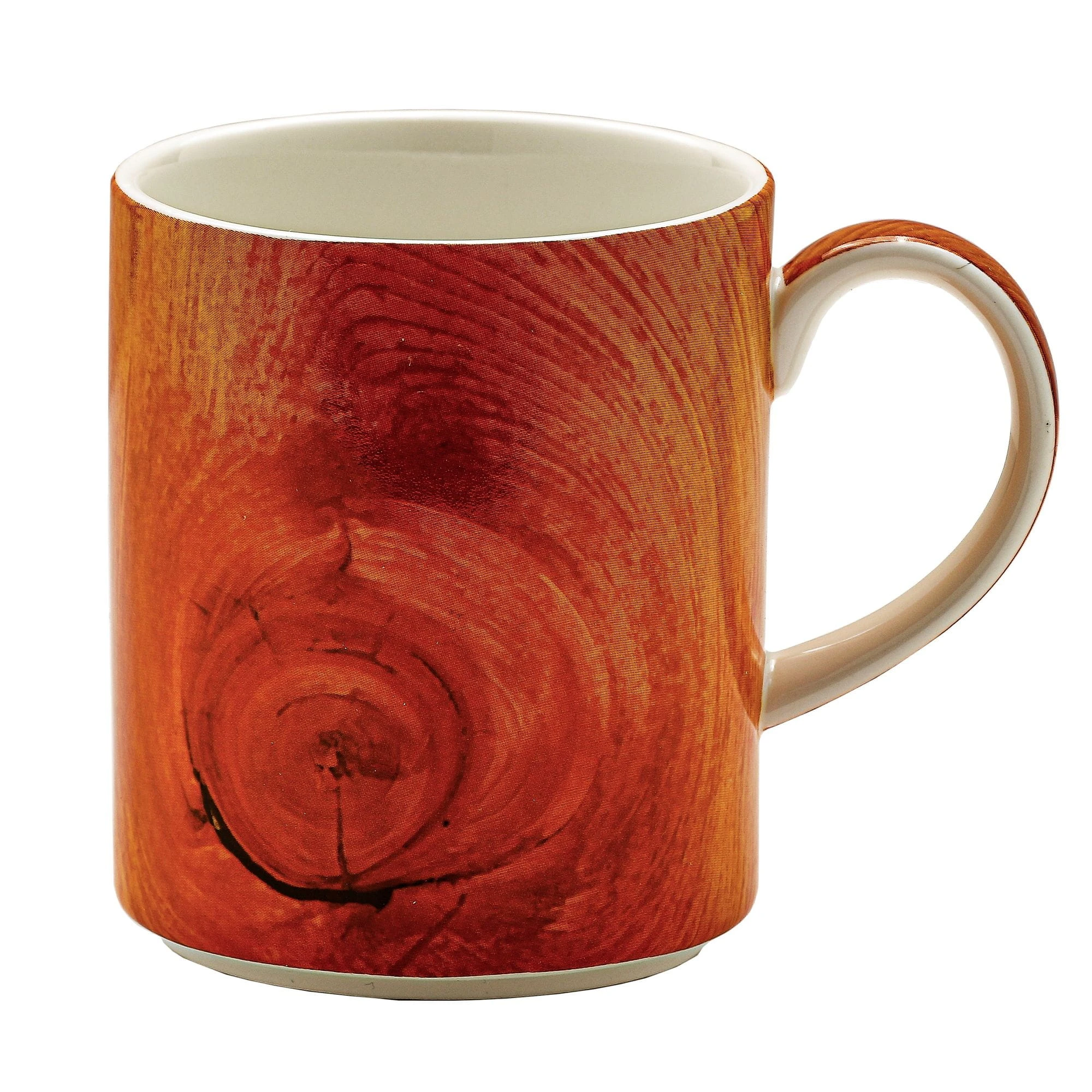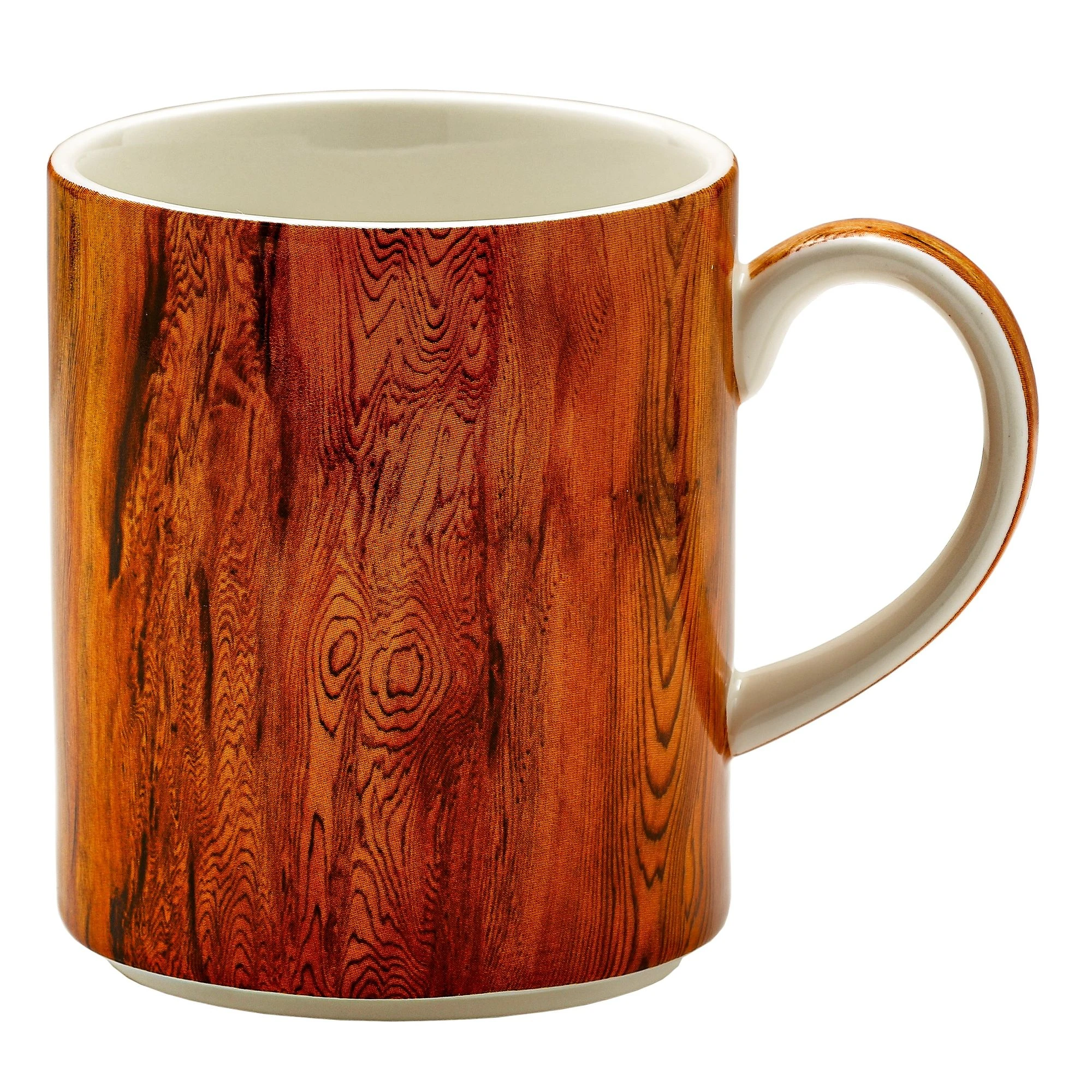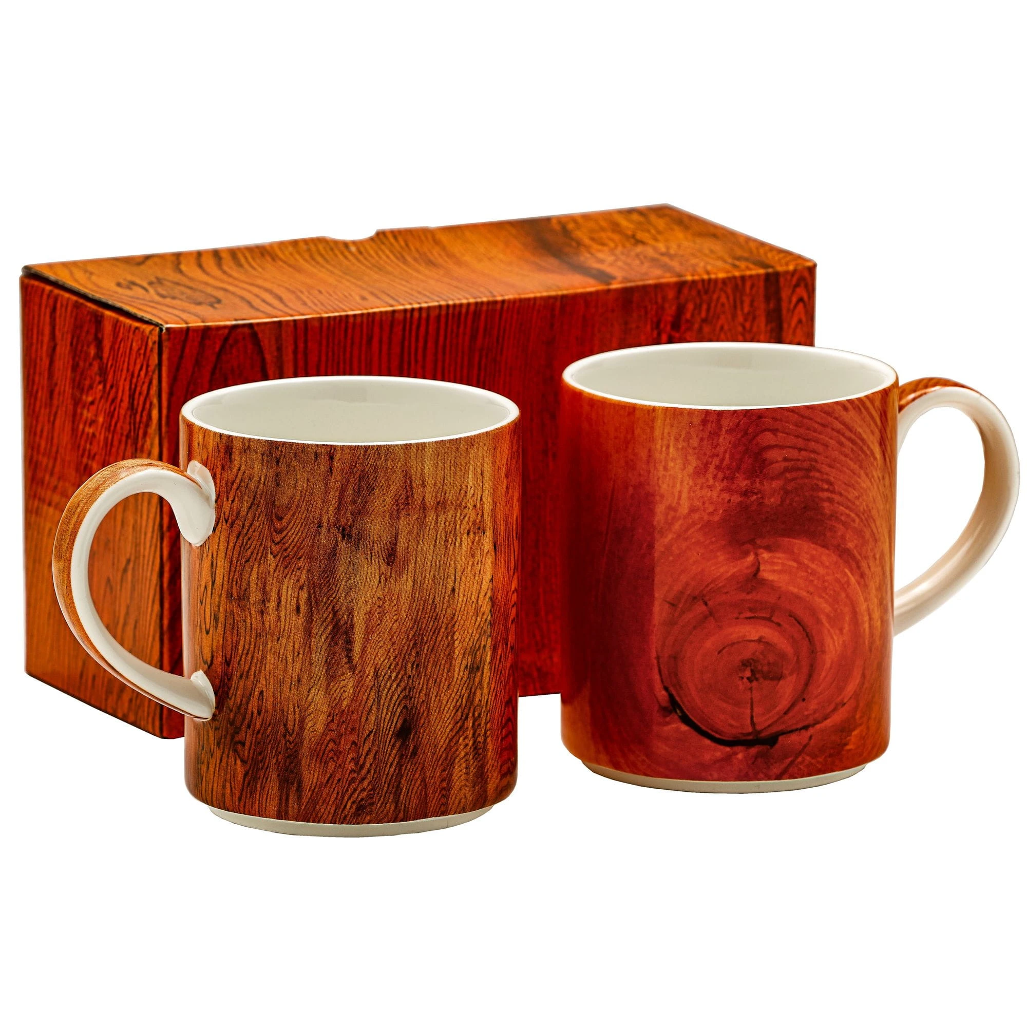 Dwa, porcelanowe, niskie kubki o tradycyjnym kształcie z naniesionym, oryginalnym "drewnopodobnym" motywem.