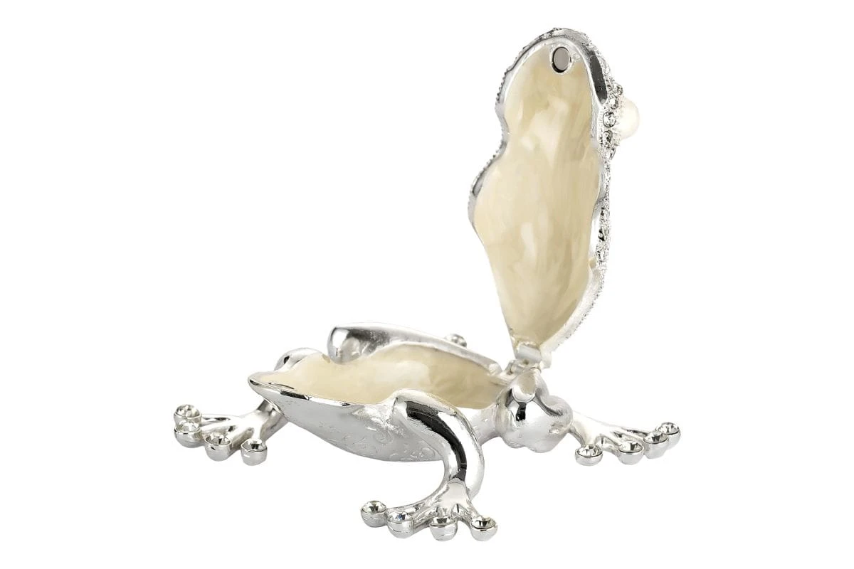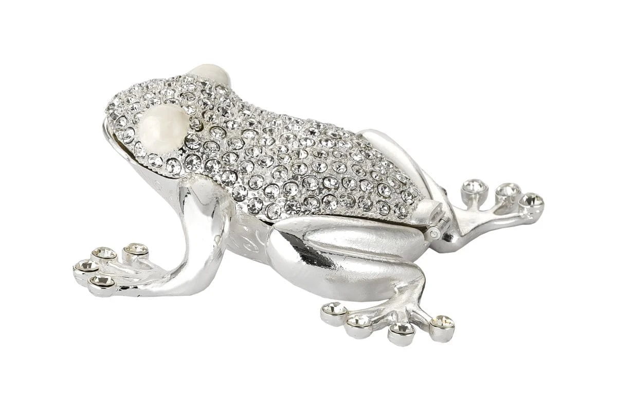 Ozdoba-otwierane PUZDERKO ŻABKA, szkatułka wykonana z posrebrzanego stopu cynku oraz żywicy epoksydowej ze zdobieniami cyrkoniami.