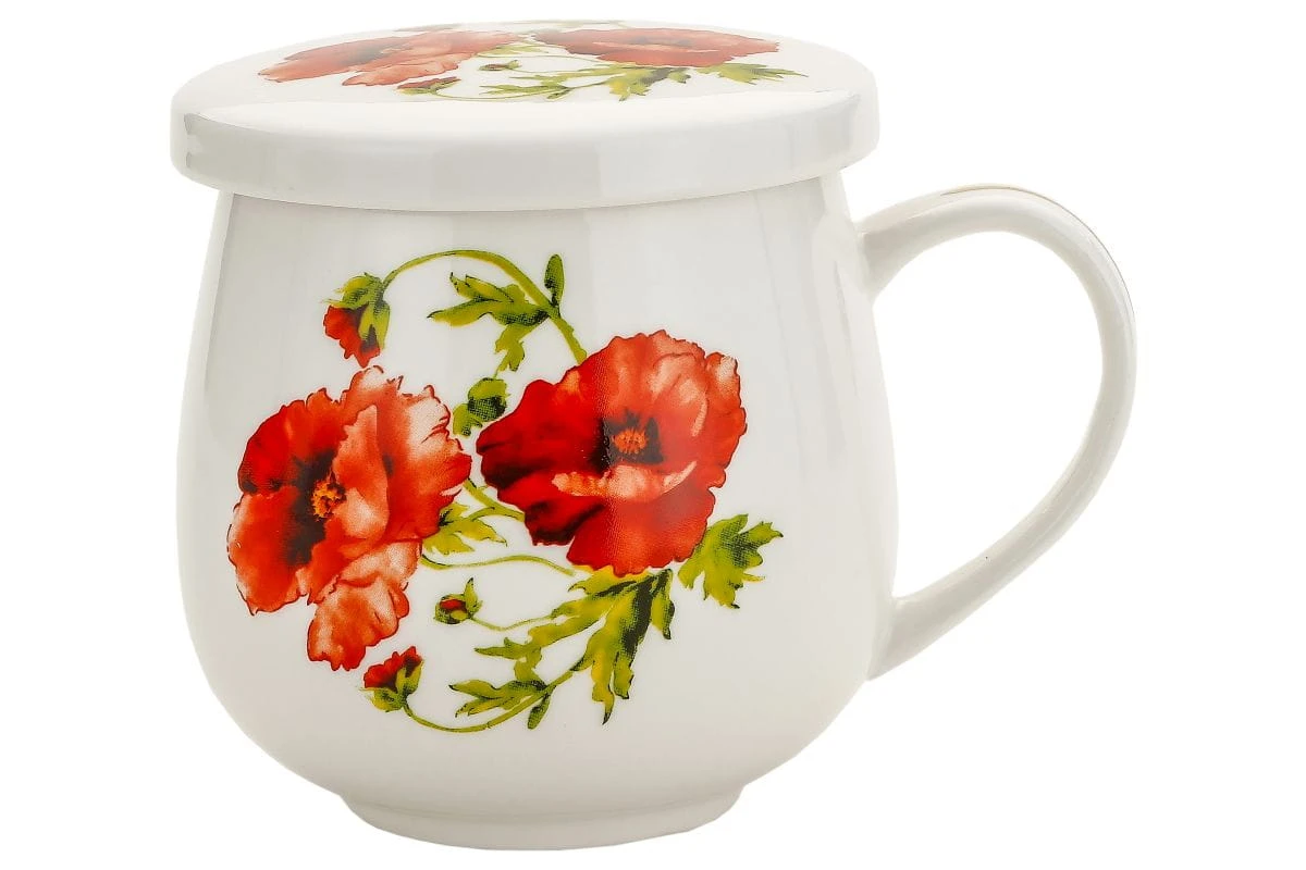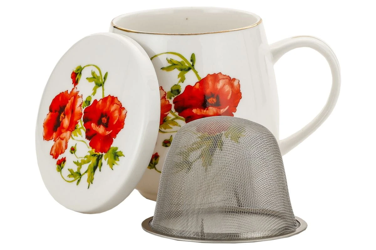 Elegancki porcelanowy kubek z metalowym zaparzaczem i dopasowaną pokrywką to idealne rozwiązanie dla miłośników herbat liściastych. Zdobiony motywem w maki, wprowadza do codziennych chwil odrobinę romantyzmu. Złocenia przy rantach dodają mu subtelnego blasku, a pokrywka nie tylko pomaga utrzymać temperaturę naparu, ale może też służyć jako podstawka pod sitko. Stylowy, praktyczny i pełen uroku – idealny na prezent lub jako codzienna przyjemność dla siebie.