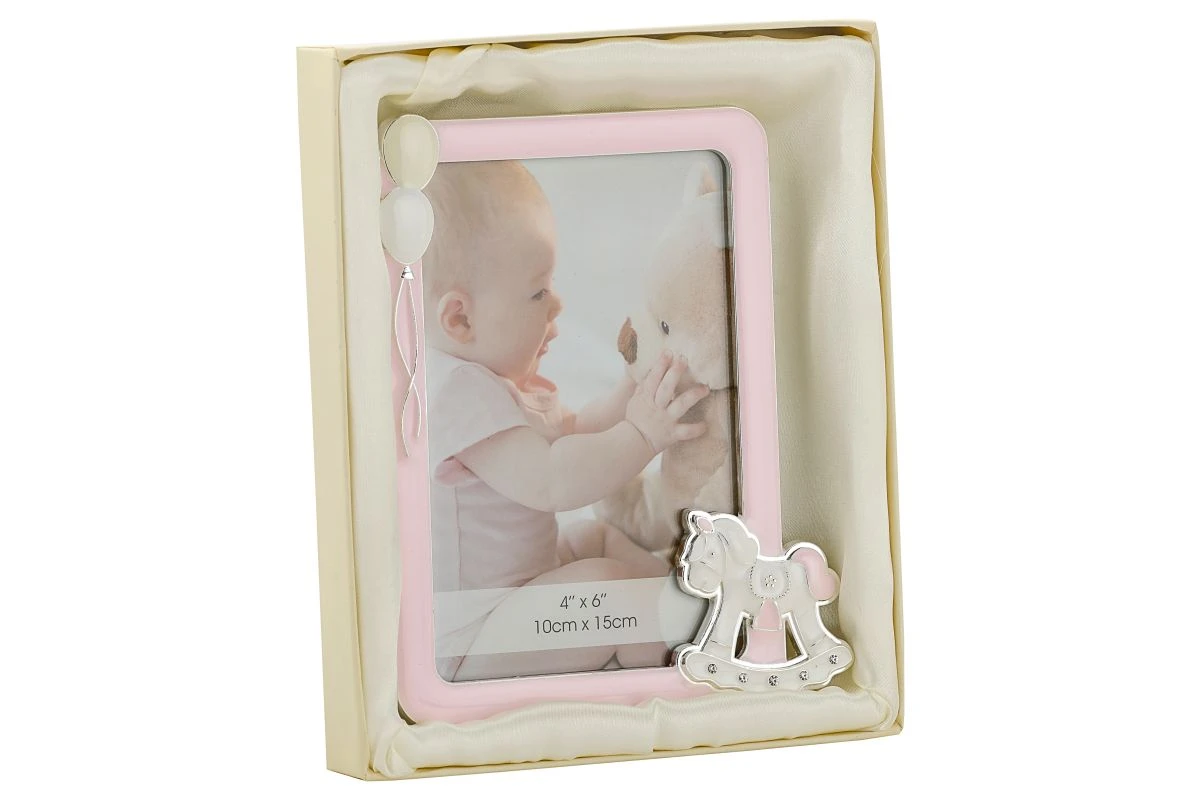 Oryginalnie wyglądająca ramka na zdjęcie ze zdobieniami(baloniki, konik na biegunach) wykonana z posrebrzanego stopu cynku oraz żywicy epoksydowej ze zdobieniami cyrkoniami oraz rewersem ramki oklejonym materiałem tekstylnym(zbliżonym do weluru).