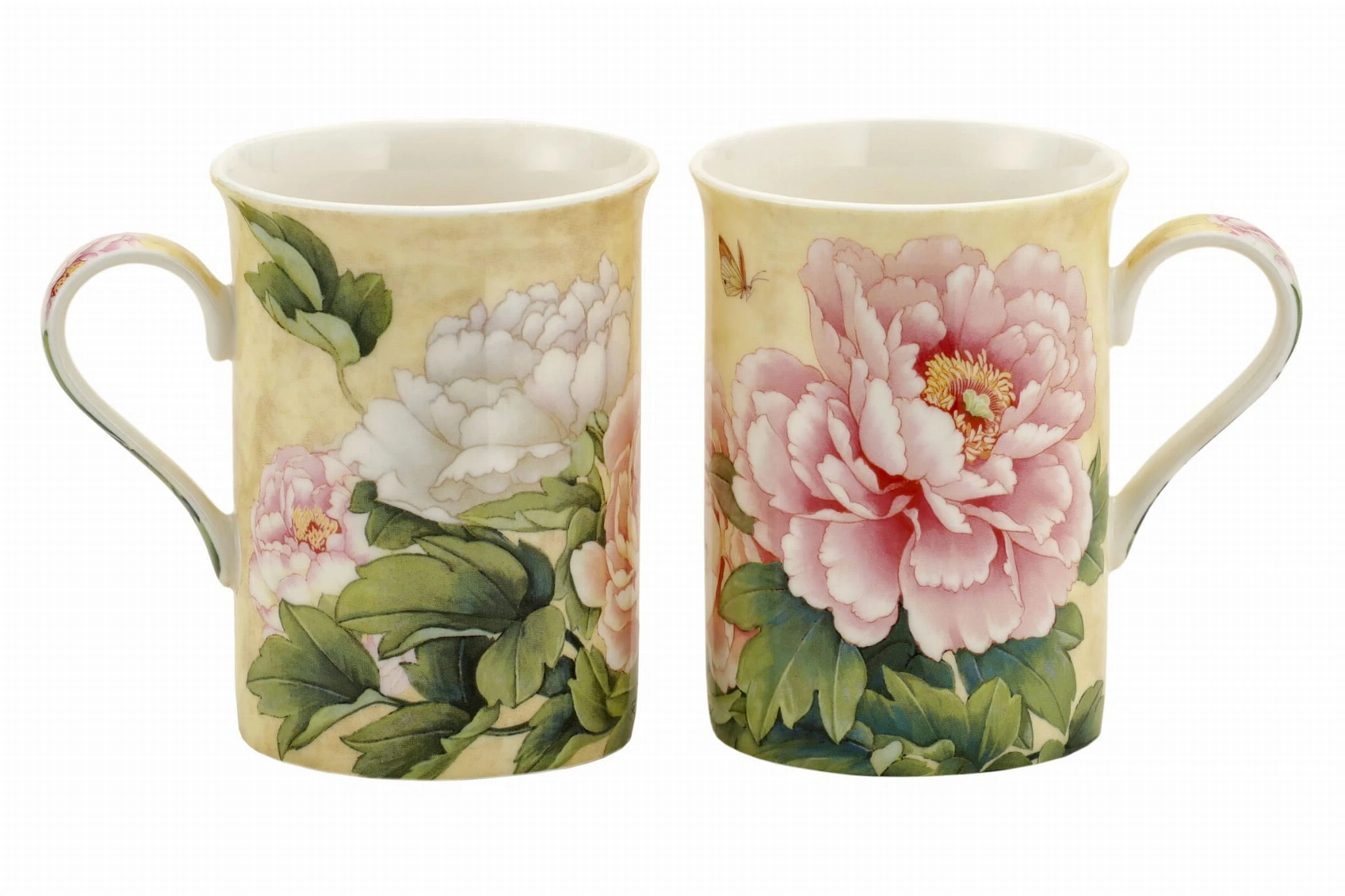 Dwa, porcelanowe kubki o tradycyjnym, prostym kształcie z naniesionym oryginalnym motywem kwiatowym.