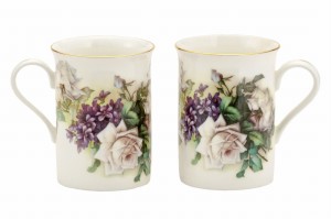 Dwa, porcelanowe kubki o tradycyjnym, prostym kształcie z naniesionym oryginalnym motywem kwiatowym.