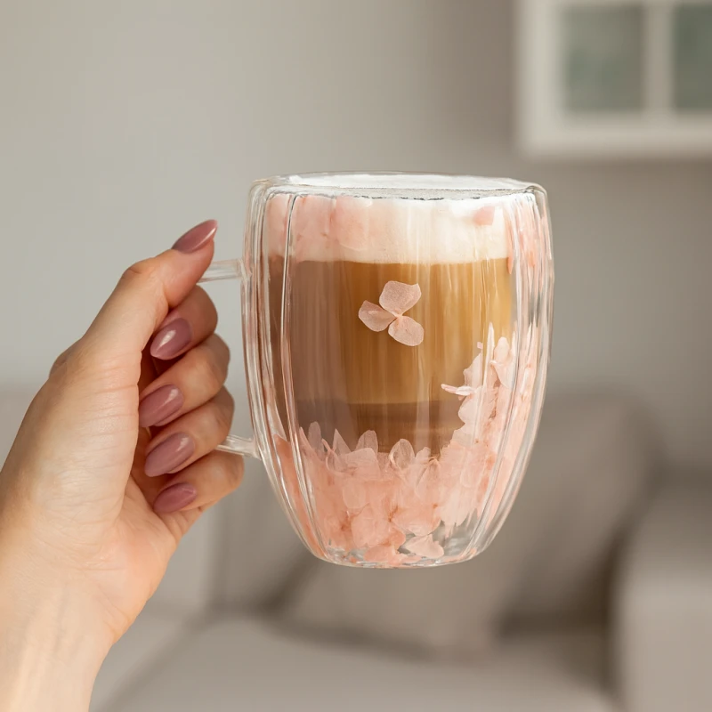 Szklanka termiczna ryflowana z kwiatami w środku, gipsówka róż 300 ml 1szt SZK157