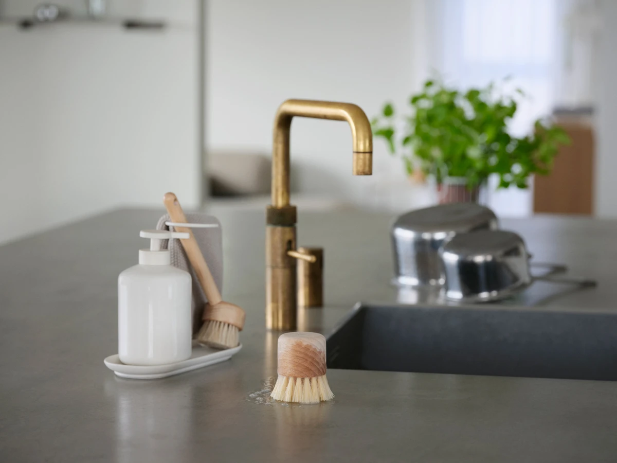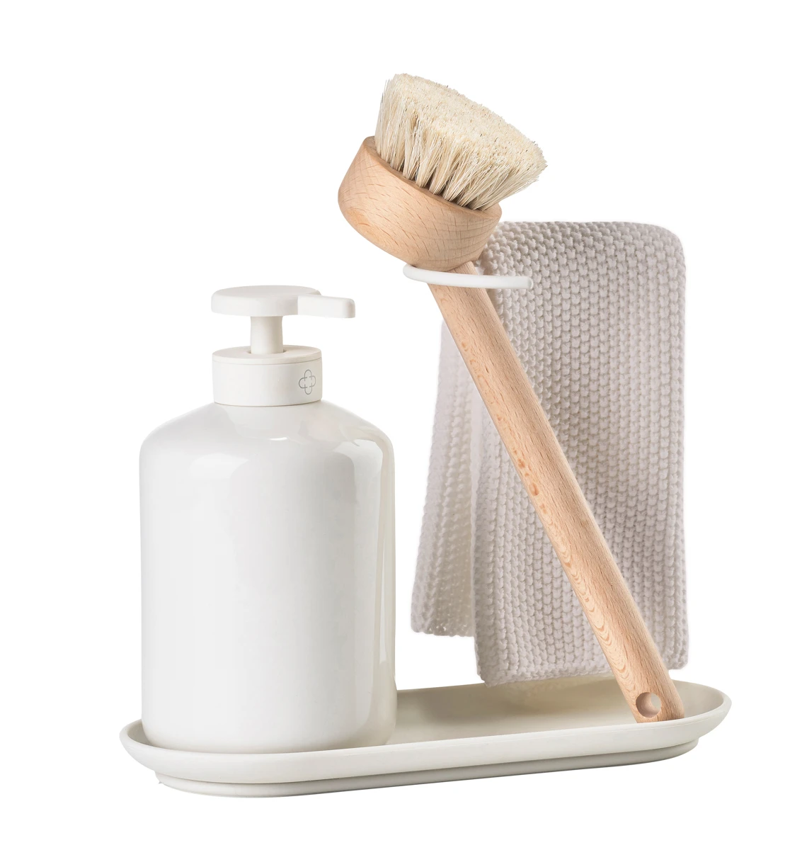 dozownik na płyn do mycia naczyń wykonany z kamionki, szczotka z drewnianym trzonkiem, wieszak na ściereczkę oraz podstawka.