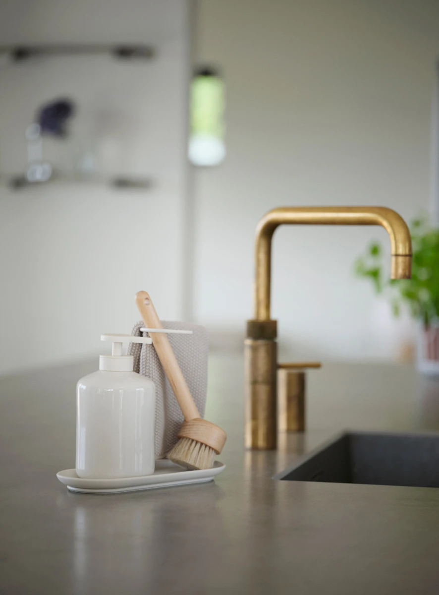 Produkt o przemyślanej formie i elementach składowych, wykonany z kamionki i metalu, zawiera wszystko, czego potrzebujesz w okolicach zlewu, zawsze pod ręką.