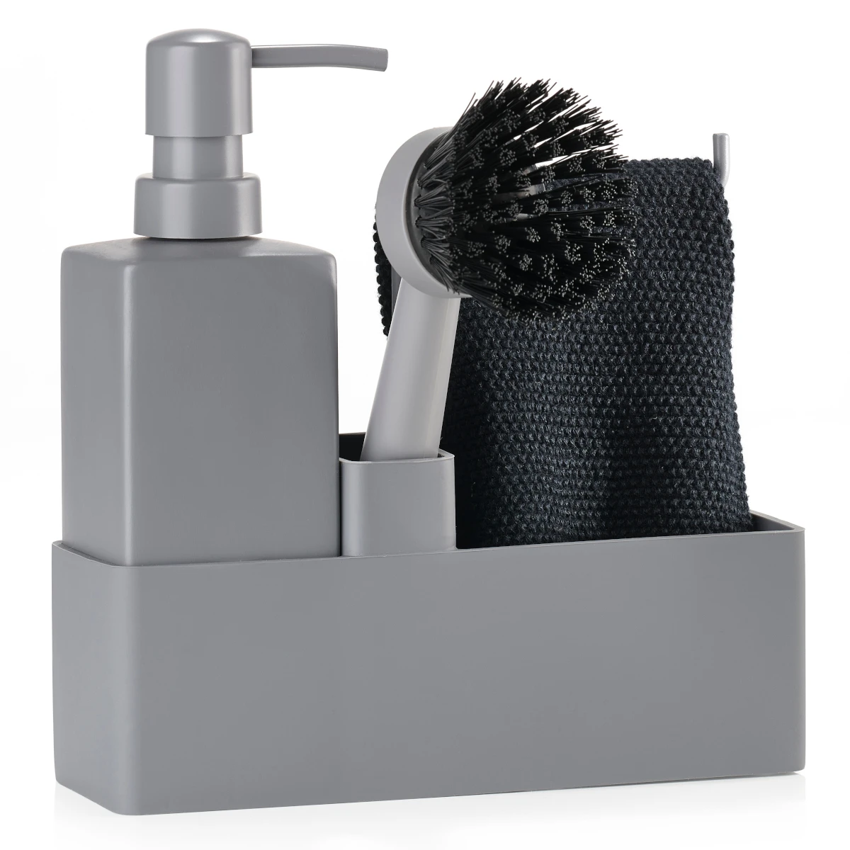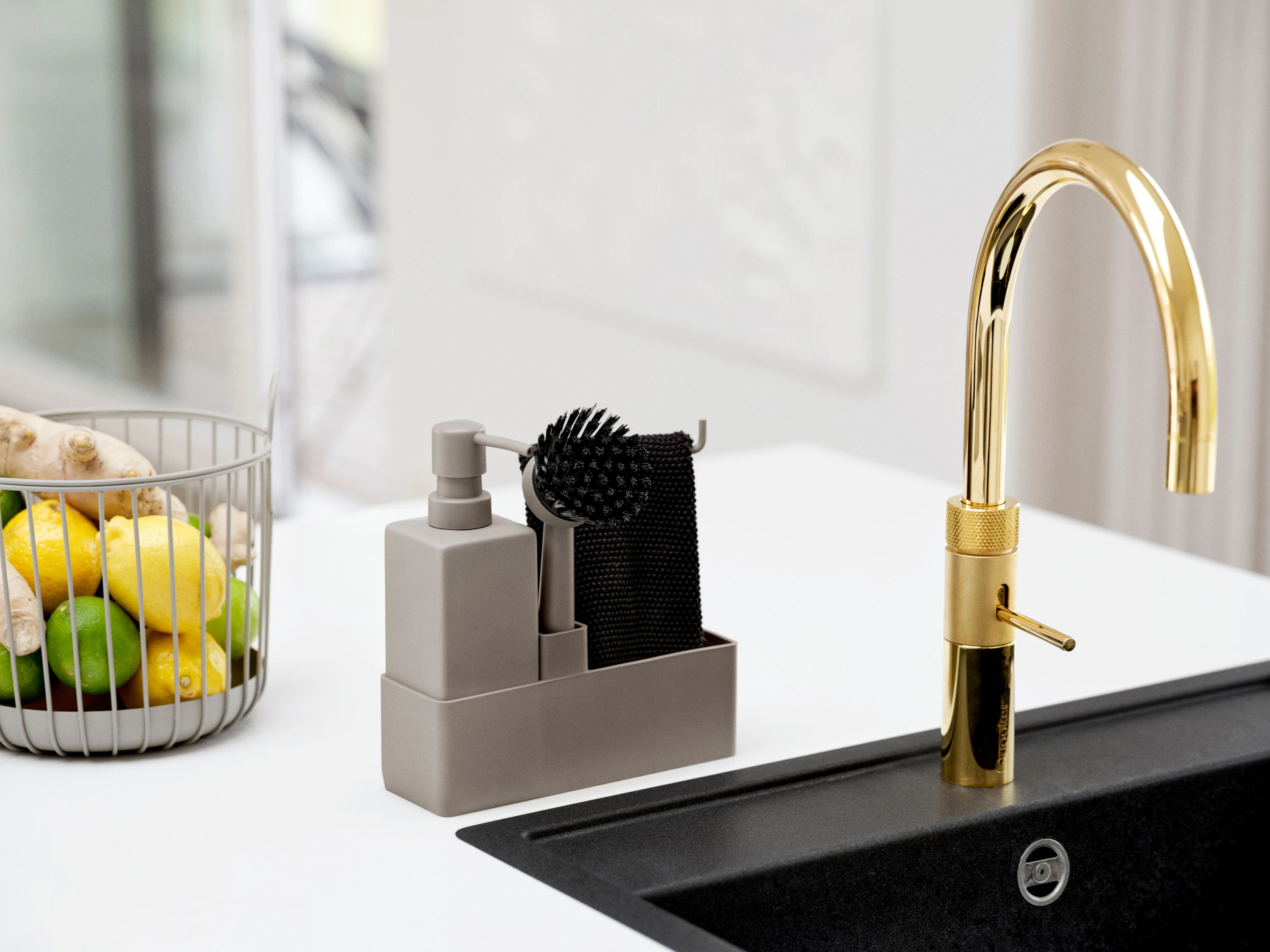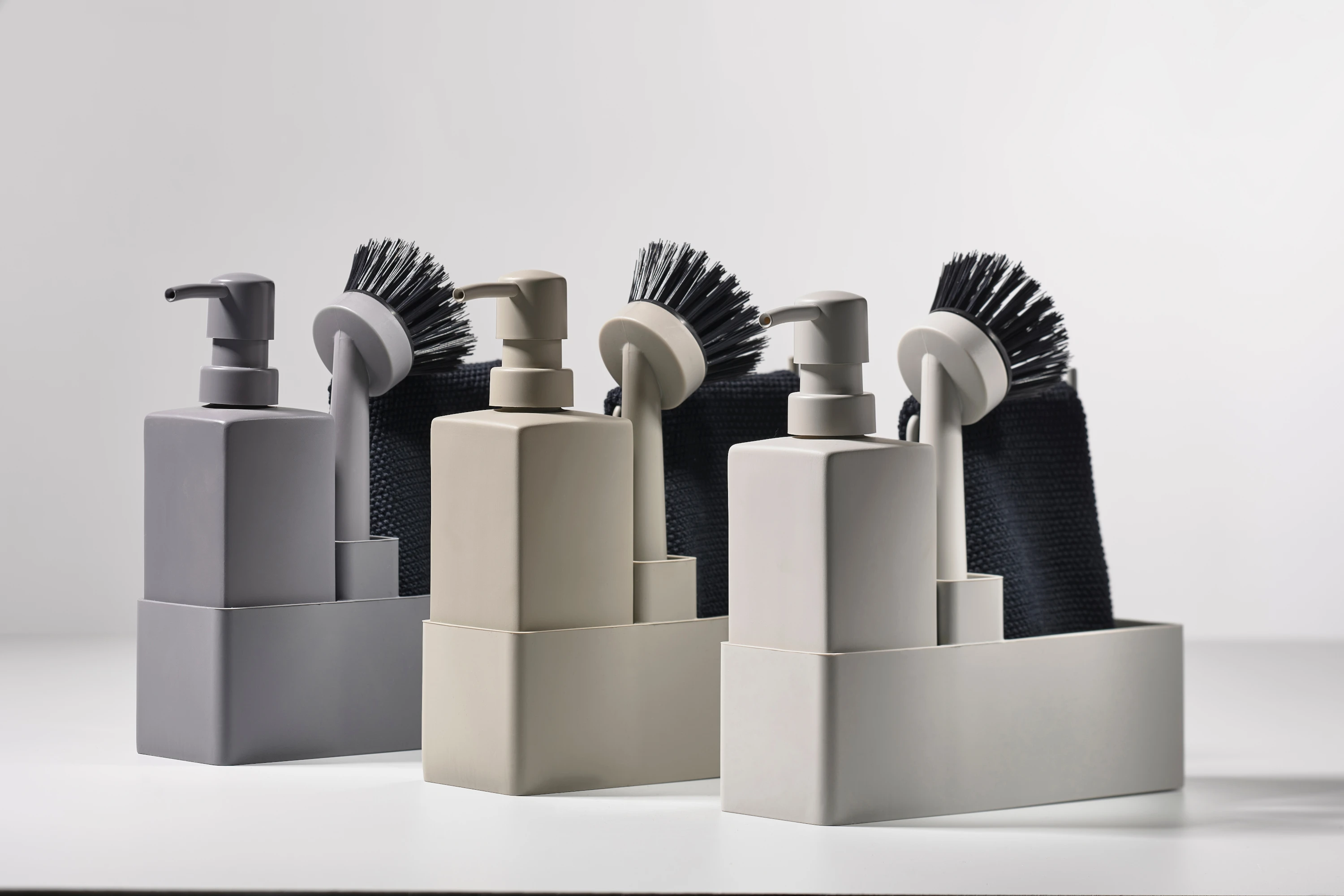 Jedną z rzeczy, które znajdziesz w naszej kolekcji Singles, jest kompaktowy, wielofunkcyjny zestaw do mycia naczyń. Idealnie pasuje do nowoczesnej kuchni. Przyjemny w dotyku. W zestawie znajduje się ceramiczny dozownik mydła, szczoteczka z wymienną końcówką oraz organizer ze ściereczką.