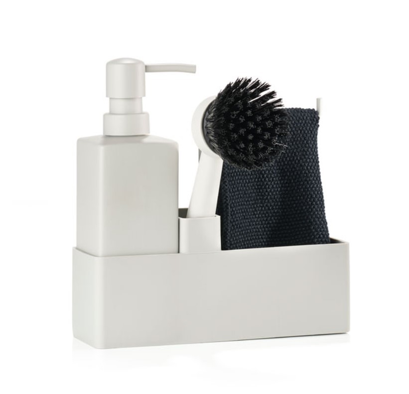 Jedną z rzeczy, które znajdziesz w naszej kolekcji Singles, jest kompaktowy, wielofunkcyjny zestaw do mycia naczyń. Idealnie pasuje do nowoczesnej kuchni. Przyjemny w dotyku. W zestawie znajduje się ceramiczny dozownik mydła, szczoteczka z wymienną końcówką oraz organizer ze ściereczką.
